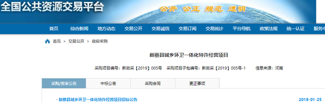 河南省新蔡縣城鄉(xiāng)環(huán)衛(wèi)一體化特許經(jīng)營項(xiàng)目發(fā)布單一來源采購招標(biāo)公告,擬推薦中國光大國際有限公司下屬光大生態(tài)資源(深圳)有限公司為項(xiàng)目供應(yīng)商。 擬采購內(nèi)容:彌陀寺鄉(xiāng)、龍口鎮(zhèn)、韓集鎮(zhèn)、孫召鎮(zhèn)、李橋鎮(zhèn)、櫟城鄉(xiāng)、棠村鎮(zhèn)、宋崗鄉(xiāng)、關(guān)津鄉(xiāng)、河塢鄉(xiāng)、佛閣寺鎮(zhèn)、余店鎮(zhèn)、陳店鎮(zhèn)、磚店鎮(zhèn)、黃樓鎮(zhèn)、澗頭鄉(xiāng)、化莊鄉(xiāng)、楊莊戶鄉(xiāng)、...