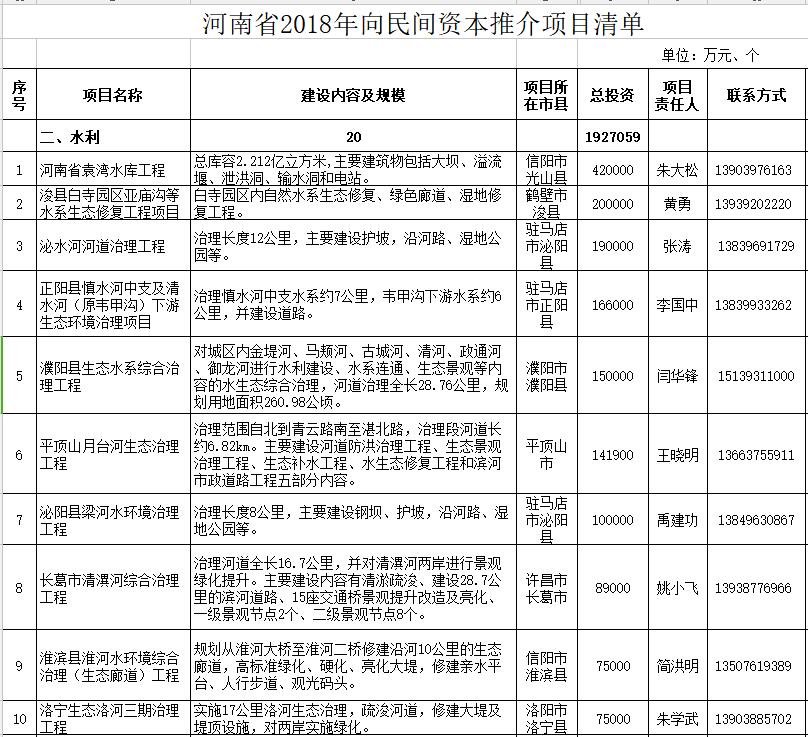 河南省2018年擬向民間資本推介項目清單(涉環(huán)保部分)