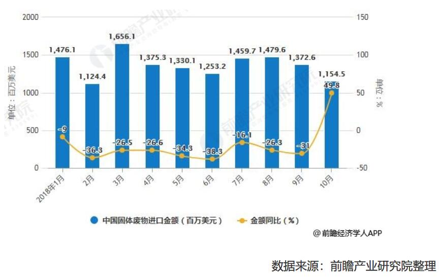 在進(jìn)口金額方面,2018年8-9月中國固體廢物進(jìn)口金額下降,2018年10月中國固體廢物進(jìn)口金額維持下降趨勢。2018年10月中國固體廢物進(jìn)口金額為1155百萬美元,同比增長49.8%。