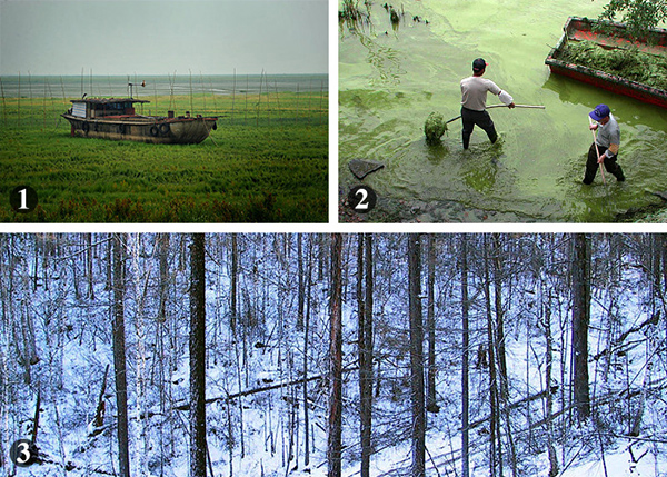 1:2011年,江西省新建縣南磯鄉(xiāng),一艘大漁船擱淺在鄱陽(yáng)湖湖底草坪上。2:2001年,工作人員在江蘇無(wú)錫黿頭渚景區(qū)“圍剿”太湖藍(lán)藻。3:2002年,采伐后大興安嶺稀疏的森林。
