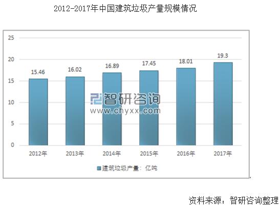 隨著城鎮(zhèn)化腳步的加速,每年我國有越來越多的建筑新建和重建,這些新建和重建的過程便會產(chǎn)生大量的建筑垃圾。由于建筑垃圾數(shù)據(jù)產(chǎn)量的統(tǒng)計存在較大難度,很少有國家建立起對建筑垃圾的統(tǒng)計體系,只能采取可獲得的數(shù)據(jù)進行合理估計。智研咨詢發(fā)布的《2019-2025年中國建筑垃圾處理行業(yè)市場發(fā)展模式調(diào)研及投資趨勢分析研究報告》中顯示:2017年國內(nèi)建筑垃圾保守估計約19.3億噸,同比2016年的18.01億噸增長了7.16%。