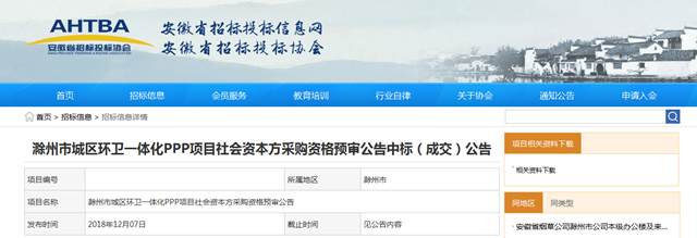 安徽滁州2億環(huán)衛(wèi)一體化PPP項目資審結果出爐