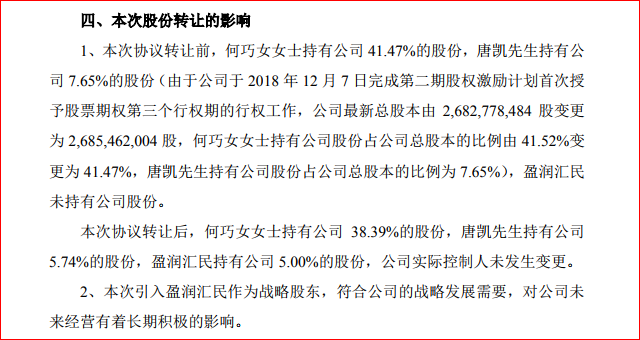 根據(jù)協(xié)議,何巧女將其持有的公司股份 82,935,718 股(占公司總股本的 3.09%)、唐凱將其持有的公司股份 51,337,383 股(占公司總股本的 1.91%),共計(jì) 134,273,101 股(占公司總股本的 5.00%)轉(zhuǎn)讓給盈潤(rùn)匯民。