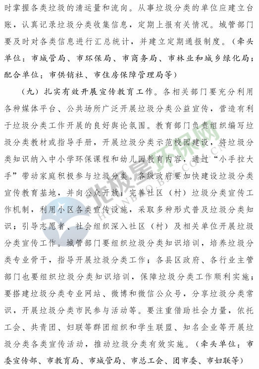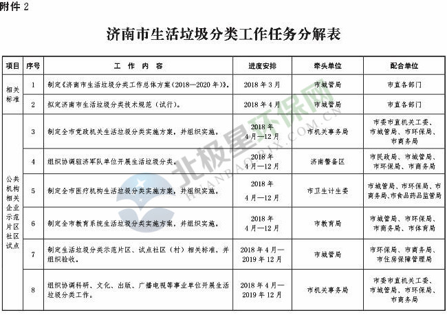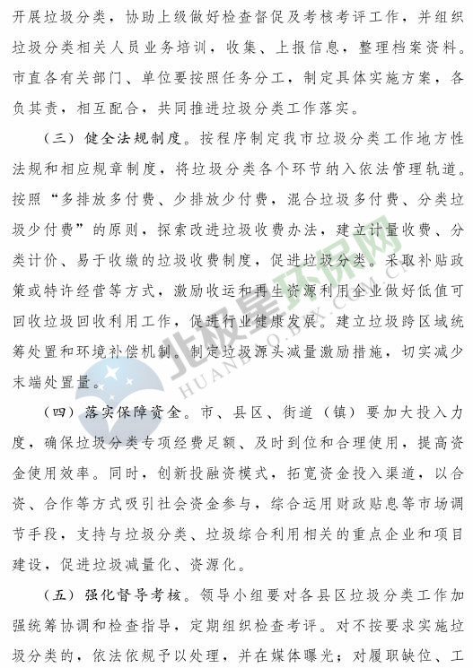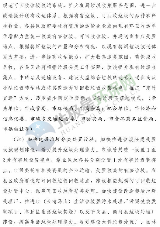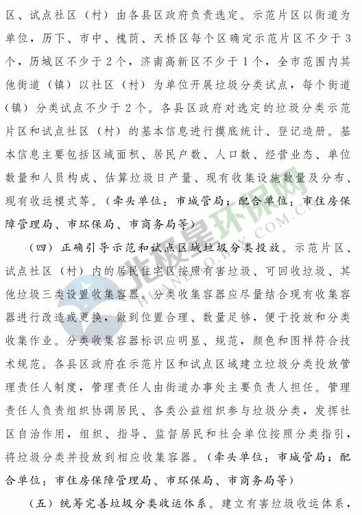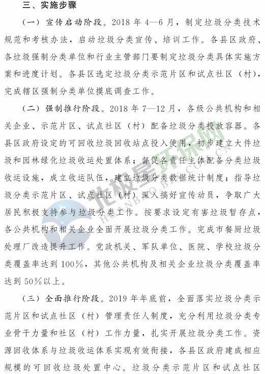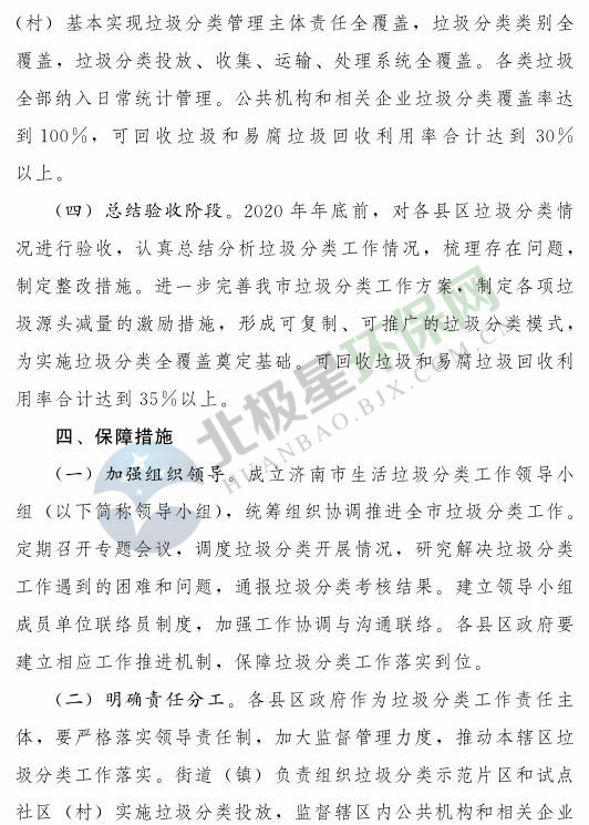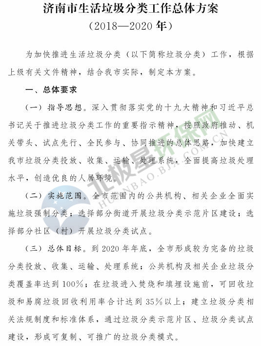 《濟(jì)南市生活垃圾分類(lèi)工作總體方案(2018—2020年)》已經(jīng)印發(fā),《方案》提出,到 2020 年年底,全市形成較為完備的垃圾分類(lèi)投放、收集、運(yùn)輸、處理系統(tǒng);公共機(jī)構(gòu)及相關(guān)企業(yè)垃圾分類(lèi)覆蓋率達(dá)到 100% ;在垃圾進(jìn)入焚燒和填埋設(shè)施前,可回收垃圾和易腐垃圾回收利用率合計(jì)達(dá)到 35% 以上;建立垃圾分類(lèi)相關(guān)法規(guī)制度和標(biāo)準(zhǔn)體系,通過(guò)垃圾分類(lèi)示范片區(qū)、垃圾分類(lèi)試點(diǎn)建設(shè),形成可復(fù)制、可推廣的垃圾分類(lèi)模式。詳情如下: