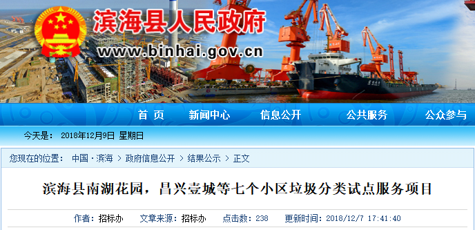 江蘇省濱??h南湖花園,昌興壹城等七個小區(qū)垃圾分類試點服務項目發(fā)布中標公告,無錫市金沙田科技有限公司成為中標的社會資本方,中標金額為106.6萬,服務期限365日歷天。
