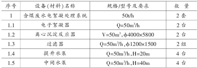 該套含煤廢水處理系統(tǒng)由:含煤廢水調(diào)節(jié)池、煤水提升泵、電子絮凝反器、離心澄清反應(yīng)器、中間水池、中間水泵、過濾器、回用水池、回用泵等組成,主要工藝設(shè)備見表1。