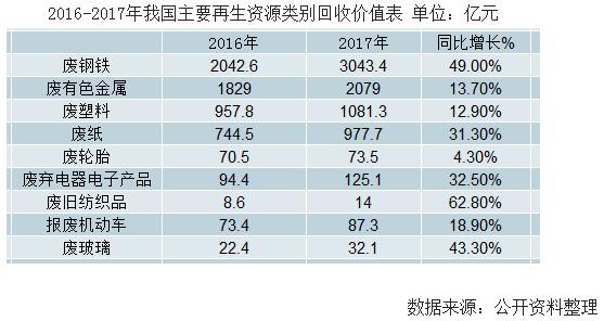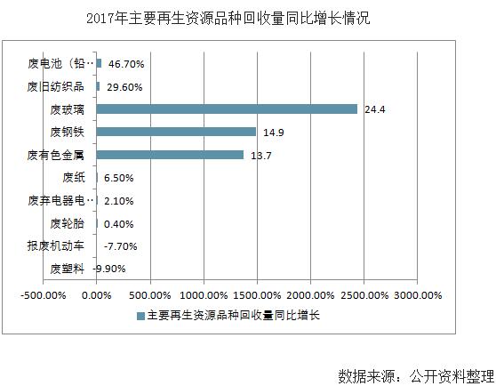 截至2017年底,我國(guó)廢鋼鐵、廢有色金屬、廢塑料、廢輪胎、廢紙、廢棄電器電子產(chǎn)品、報(bào)廢機(jī)動(dòng)車、廢舊紡織品、廢玻璃、廢電池十大類別的再生資源回收總量為2.82億噸,同比增長(zhǎng)11%。其中,廢電池、廢玻璃、廢舊紡織品回收量增幅較為明顯,分別增長(zhǎng)46.7%、24.4%和29.6%;廢塑料和報(bào)廢機(jī)動(dòng)車回收量出現(xiàn)下滑,分別同比減少9.9%和7.7%。