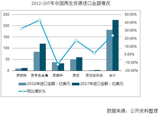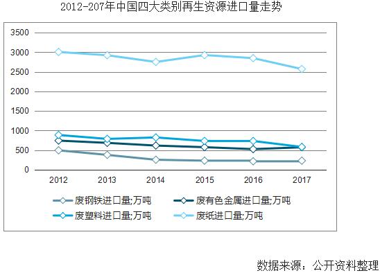 2017年,我國(guó)廢鋼鐵、廢有色金屬、廢塑料、廢紙、廢舊紡織品五大類別的再生資源進(jìn)口總量3620.9萬噸,同比下降9.9%。其中降幅最大的是廢塑料,同比下降20.7%。廢舊紡織品進(jìn)口量與2016年相比,減少6.2%。再生資源進(jìn)口量下降主要是由于《禁止洋垃圾入境推進(jìn)固體廢物進(jìn)口管理制度改革實(shí)施方案》等一系列政策對(duì)行業(yè)產(chǎn)生的影響逐漸顯現(xiàn)。