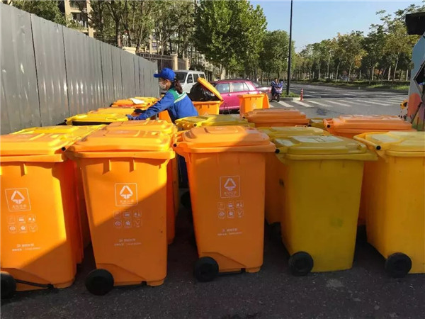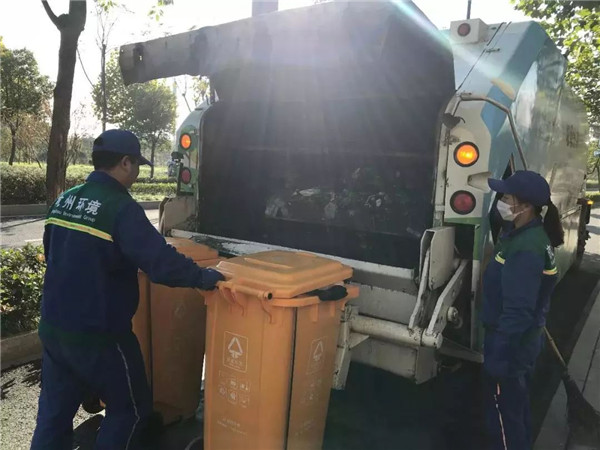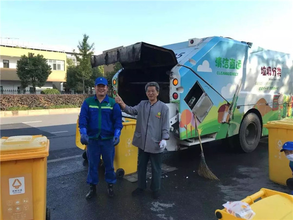 8點30分,龔磊來到了第三車的第一個作業(yè)點,丁橋陽光翡麗灣。這個時間點,上班的上班,上學的上學。小區(qū)保潔員過來把已經(jīng)清空的垃圾桶拖回小區(qū)集置點,保潔大伯不斷夸著這兩個年輕人干活利索,態(tài)度又好,非得跟龔磊來了一張難得的合影并豎起了大拇指,而龔縵琴害羞地躲開去拉桶了。