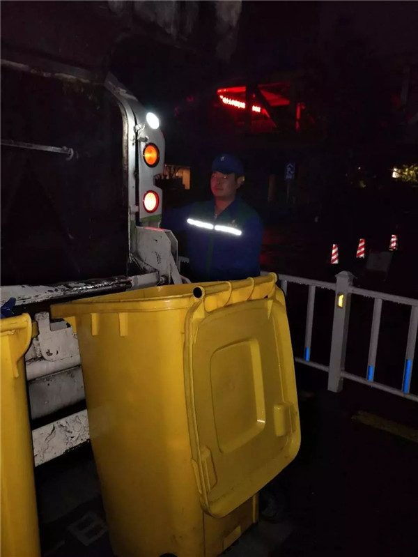 龔磊作業(yè)的線路要收運三車垃圾,為了減少對居民的打擾,第一、第二車線路安排在錢江新城寫字樓作業(yè)。3點半,龔磊、龔縵琴在市民街開始第一個作業(yè)點的垃圾收運。