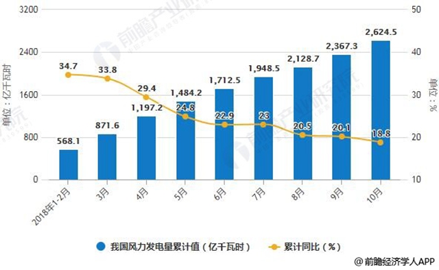 2018年1-10月我國(guó)風(fēng)力發(fā)電量統(tǒng)計(jì)及增長(zhǎng)情況