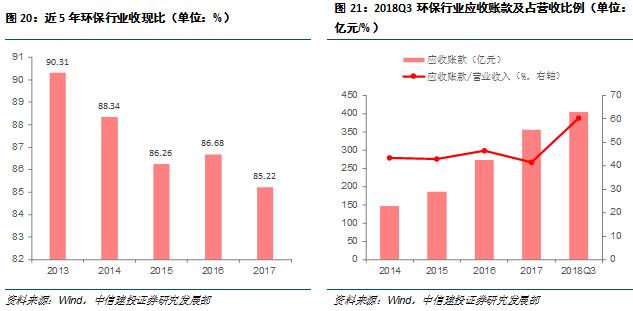 去杠桿條件下提升投資效率,維持二者緊平衡。對于融資環(huán)境帶來的壓力,企業(yè)在對于投資以及項(xiàng)目招標(biāo)上既需要清楚認(rèn)識(shí)投資目的,也需要盡可能提高資金運(yùn)用效率,努力做到有限資金利用價(jià)值的最大化。近五年來環(huán)保行業(yè)的收入現(xiàn)金比不斷下降,由2013年的90.31%下降到2017年85.22%,但行業(yè)的應(yīng)收賬款占營收比例卻不斷增長,由去年的41.52%上漲到60.27%。因此,強(qiáng)化風(fēng)險(xiǎn)意識(shí)、加強(qiáng)經(jīng)營管理、提升回款速度成為公司發(fā)展重中之重,怎樣實(shí)現(xiàn)有效融資以及改善現(xiàn)金流迫在眉睫。