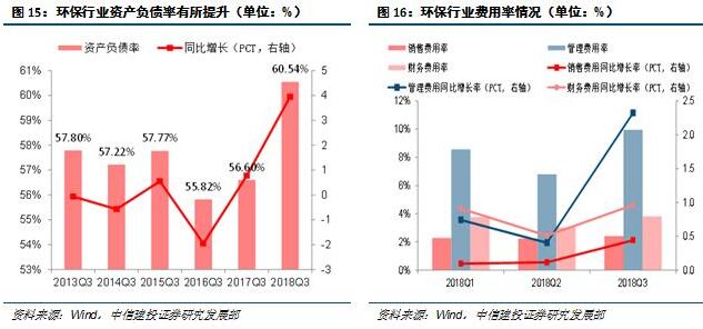 融資遇困,資產(chǎn)負(fù)債率高,行業(yè)債務(wù)壓力大。對于環(huán)保行業(yè)來說,由于其行業(yè)性質(zhì)和商業(yè)模式,前期往往需要較大比例的資金投入,墊資較多,所以融資形勢對于推動(dòng)項(xiàng)目進(jìn)行起到了至關(guān)重要的作用。通過對我們選取的115個(gè)環(huán)保行業(yè)股票進(jìn)行跟蹤,發(fā)現(xiàn)2018上半年融資環(huán)境持續(xù)緊縮、環(huán)保公司資產(chǎn)負(fù)債率進(jìn)一步提升。前三季度整體資產(chǎn)負(fù)債率60.54%,同比增長3.94PCT,其中有69家企業(yè)的資產(chǎn)負(fù)債率較去年同期有不同程度的增長,并且有32家企業(yè)的資產(chǎn)負(fù)債率已經(jīng)超過60%。前三季度環(huán)保公司期間費(fèi)用率為14.28%,同比增加2.16PCT,繼續(xù)呈上升趨勢,其中管理費(fèi)用率8.41%,同比上升1.15個(gè)PCT;財(cái)務(wù)費(fèi)用率3.54%,同比上升0.79PCT;銷售費(fèi)用率2.33%,同比上升0.23PCT。我們對行業(yè)21家核心龍頭公司近三年的融資情況進(jìn)行了分析,以啟迪桑德為例,2016年發(fā)行債券總額為70億元,利率水平在2.75%~4.05%之間,2017年發(fā)行債券總額為65億元,利率水平為4.5%~6.7%,2018年發(fā)行債券總額為35億元,利率水平則為5%~6.3%,發(fā)債規(guī)模逐年遞減,債券利率卻逐年增加;股權(quán)融資方面,只有五家企業(yè)成功實(shí)現(xiàn)股權(quán)融資,分別為博世科、中國光大國際、金圓股份、啟迪桑德以及盈峰環(huán)境,企業(yè)在資金融通環(huán)節(jié)仍舊面臨較大壓力。