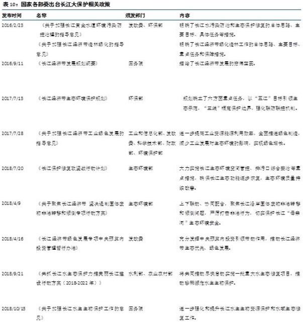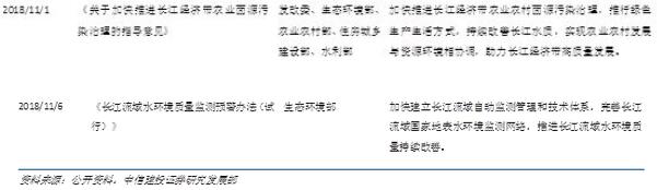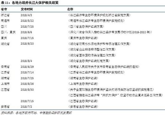 截至2018年11月,國家各部委已發(fā)布12臺(tái)關(guān)于長江經(jīng)濟(jì)帶保護(hù)和發(fā)展的政策,分別從長江經(jīng)濟(jì)帶的發(fā)展規(guī)劃、污染治理指標(biāo)、資金保障、監(jiān)測機(jī)制等方面對長江大保護(hù)行動(dòng)提供指導(dǎo)和支持。其中《長江經(jīng)濟(jì)帶生態(tài)環(huán)境保護(hù)規(guī)劃》明確了長江經(jīng)濟(jì)帶在2020年的環(huán)境指標(biāo)。地方層面上,各地方政府均制定了地方《生態(tài)保護(hù)紅線》,確定了生態(tài)保護(hù)的保護(hù)區(qū)域,并依據(jù)地方各省市自身環(huán)境情況制定環(huán)境保護(hù)行動(dòng)方案。