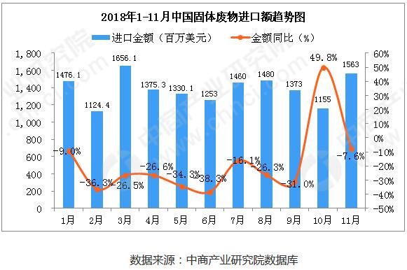 從金額方面來看,2018年8-10月中國固體廢物進(jìn)口金額呈下降趨勢(shì),2018年11月中國固體廢物進(jìn)口金額有大幅度回升;2018年11月中國固體廢物進(jìn)口金額為1563百萬美元,同比下降7.6%。