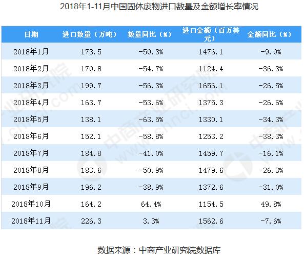 據(jù)中商產(chǎn)業(yè)研究院數(shù)據(jù)庫顯示,2018年11月中國固體廢物進(jìn)口量大幅度增長,2018年11月中國固體廢物進(jìn)口量為226.3萬噸,同比增長3.3%。