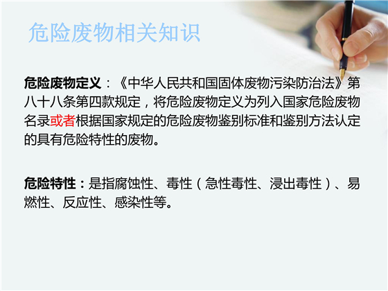 2018年石家莊市固體廢物管理培訓(xùn)會議課件日前公布,其中,“危險廢物法律法規(guī)和標(biāo)準(zhǔn)規(guī)范”共108張PPT,從固體廢物相關(guān)知識、我國危險廢物的主要法律制度、危險廢物規(guī)范化管理指標(biāo)體系、2018年度危險廢物規(guī)范化管理督查考核四方面進行了詳細闡述。詳情如下: