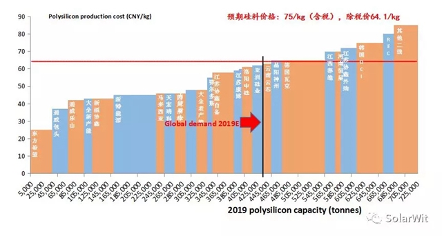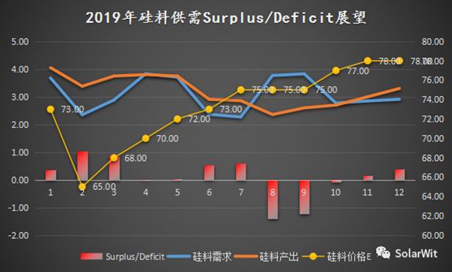 在44.3萬噸需求假設下,2019年硅料供給平衡曲線為: