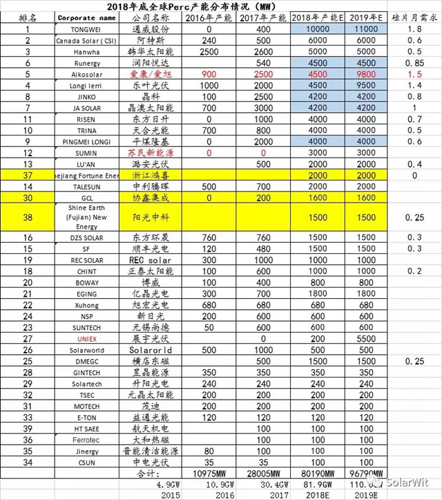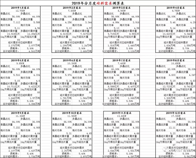 這個表格中的數(shù)據(jù)需要做一個說明,根據(jù)對供應鏈的追蹤:12月當月Perc的有效電池產(chǎn)能為60GW,并沒有達到圖中所說的81.9GW,這是因為從銘牌產(chǎn)能到有效產(chǎn)出還需要一個調(diào)試的過程。當前有很多新建和技改的電池產(chǎn)能正在調(diào)試的路上,預期2019年3月份末會達產(chǎn),屆時每月對單晶硅片的需求量會達到12.1億片。