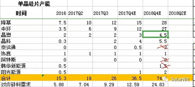 上面這張截圖是2017年年底總結的,現(xiàn)在回顧他發(fā)現(xiàn)基本不用修改,因為沒有新增的進入者,反倒是有幾家公司并沒有如期達產(chǎn);京運通原本計劃中的3GW產(chǎn)能現(xiàn)在也沒有蹤影;阿特斯之前拋出了雄心勃勃的計劃,但實際上目前只有24臺單晶爐做中試線;韓華新能源也同樣,并沒有有效產(chǎn)能出來,依然需要通過外部采購。當前市場中有效的單晶硅片產(chǎn)能實際上只有四家但是由于晶科、晶澳只自用不外供,所以對于市場上第三方公開對外銷售的產(chǎn)能,有效供給只有兩家:隆基和中環(huán),在硅片環(huán)節(jié),迅速地形成了雙寡頭壟斷的產(chǎn)業(yè)格局。這是供給端,我們再看看單晶硅片的需求端: