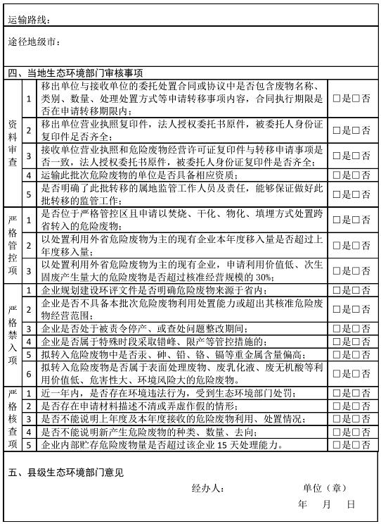 二、從嚴把控危險廢物跨省轉(zhuǎn)入。各級生態(tài)環(huán)境部門要認真貫徹《河北省固體廢物污染環(huán)境防治條例》,嚴格控制省外的危險廢物轉(zhuǎn)移至我省行政區(qū)域內(nèi)貯存或者處置。要對照“河北省固體(危險)廢物跨省移入申請表”(附件),從嚴核查跨省轉(zhuǎn)入申請。