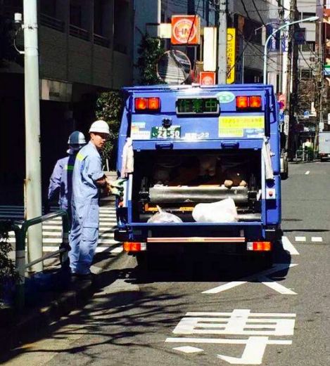 是的,在日本,真正環(huán)衛(wèi)工人只負(fù)責(zé)將一袋袋分類好的垃圾袋裝車帶走處理即可。
