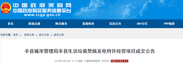 江蘇省豐縣生活垃圾焚燒發(fā)電特許經(jīng)營項(xiàng)目發(fā)布成交公告,中國光大綠色環(huán)保有限公司成為中標(biāo)的社會資本方,生活垃圾處理服務(wù)費(fèi)單價(jià)為65元/噸。