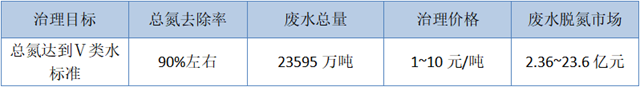 按照2017年的數(shù)據(jù),總氮要達(dá)到Ⅴ類水標(biāo)準(zhǔn),還需去除總氮3855.1噸,總氮排放量4327噸,總氮去除率為90%左右,廢水總量為23595萬(wàn)噸。市場(chǎng)上對(duì)總氮治理每噸價(jià)格差別較大,在1~10元之間,治理市場(chǎng)可達(dá)2.36~23.6億元。
