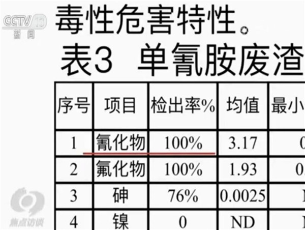 由清華大學(xué)亞洲太平洋地區(qū)危險廢物管理培訓(xùn)與技術(shù)轉(zhuǎn)讓中心出具的具有法律效力的檢測報告中稱,這些的單氰胺廢渣,無機氰化物檢出率為100%,50個樣品中有11個氰化物浸出毒性超標,最大值超標4倍。這就是說,這批廢渣已經(jīng)不是一般工業(yè)固體廢棄物,而屬于危險工業(yè)固體廢棄物,建議歸類為“HW38有機氰化物廢物”。