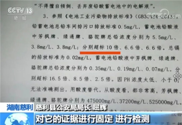 今年2月到9月,湖南省、廣東省等多家第三方檢測(cè)中心傳來(lái)消息,警方在案發(fā)現(xiàn)場(chǎng)抽取的非法排放的鉛酸液,最高超過(guò)國(guó)家《電池工業(yè)污染排放標(biāo)準(zhǔn)》的10倍;對(duì)案發(fā)現(xiàn)場(chǎng)內(nèi)廁所蹲坑周邊土壤布點(diǎn)采樣,發(fā)現(xiàn)土壤存在重金屬鉛超標(biāo)。