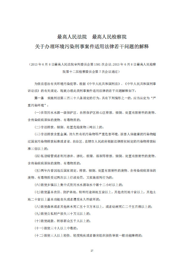 《最高人民法院、最高人民檢察院關(guān)于辦理環(huán)境污染刑事案件適用法律若干問題的解釋》已于2016年11月7日由最高人民法院審判委員會第1698次會議、2016年12月8日由最高人民檢察院第十二屆檢察委員會第58次會議通過,現(xiàn)予公布,自2017年1月1日起施行。