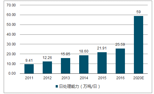 “十三五”全國城鎮(zhèn)生活垃圾無害化處理設(shè)施建設(shè)規(guī)劃》提出,到2020年全國垃圾焚燒處理能力達(dá)到59.14萬噸/日,占無害化處理能力的比例達(dá)到54%。