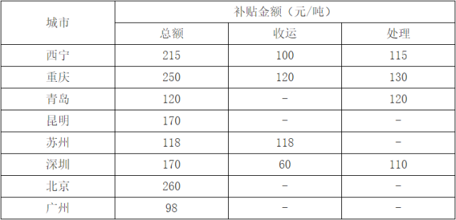 我國部分城市餐廚運(yùn)營補(bǔ)貼