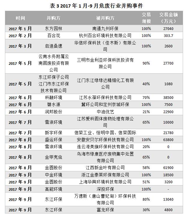 根據(jù)已有公開(kāi)數(shù)據(jù)的不完全統(tǒng)計(jì),截至2017年9月,2017年危廢行業(yè)發(fā)起并購(gòu)行為19起起,累積交易金額32.46億元,并購(gòu)方既包括像東江環(huán)保、啟迪桑德、新宇環(huán)保這樣的“行業(yè)老兵”,也不乏碧水源、盛運(yùn)環(huán)保、中金環(huán)境等“后起之秀”,更有金圓股份等“跨界來(lái)者”。
