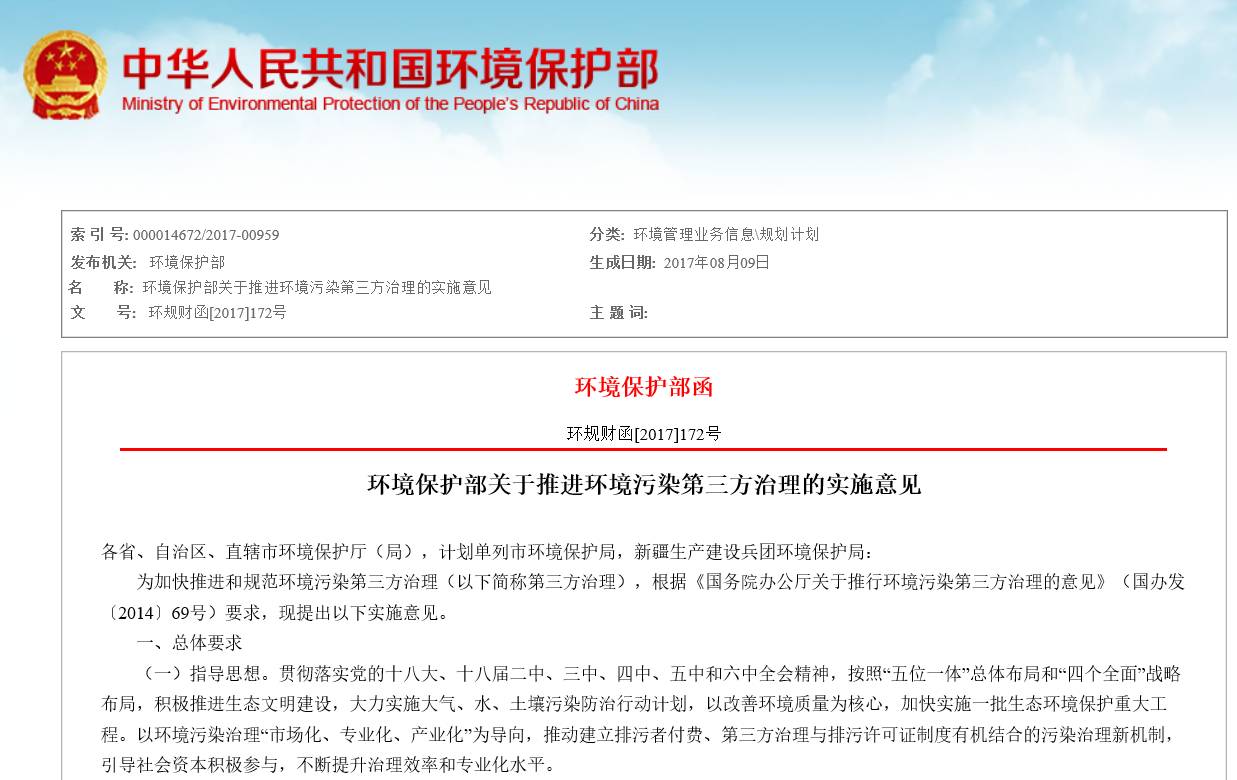 為加快推進和規(guī)范環(huán)境污染第三方治理,環(huán)保部發(fā)布《環(huán)境保護部關(guān)于推進環(huán)境污染第三方治理的實施意見》。文件中,細化環(huán)境污染第三方治理。劃定第三方責任,指出第三方治理單位應建立臺賬記錄,將構(gòu)建第三方治理信息平臺。企業(yè)污染排放超標超總量的,將實施第三方限期治理。并提出引入第三方支付機制,依環(huán)境績效付費。