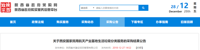 2018年12月27日,西安國家民用航天產(chǎn)業(yè)基地生活垃圾分類服務(wù)發(fā)布采購結(jié)果公告,中國天楹股份有限公司成為中標(biāo)的社會資本方,中標(biāo)金額為591萬。
