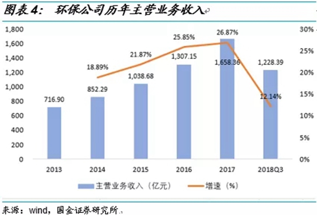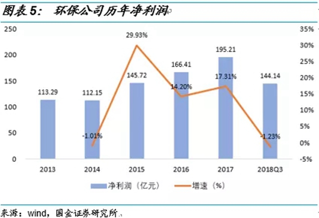 我們統(tǒng)計(jì)了環(huán)保(中信)指數(shù)包含的62家環(huán)保上市公司的營(yíng)收與凈利潤(rùn)情況,環(huán)保公司主營(yíng)業(yè)務(wù)收入2013-2017年保持較高速度增長(zhǎng),且增速逐年提高,2017年達(dá)到1658億元,增速為26.87%。而2018年前三季度主營(yíng)收入為1228億,增速明顯放緩至12.14%。與此同時(shí),環(huán)保上市公司在2018年前三季度的凈利潤(rùn)增長(zhǎng)轉(zhuǎn)正為負(fù),由2017年的17.31%降為-1.23%,前三季度凈利潤(rùn)為144.14億。