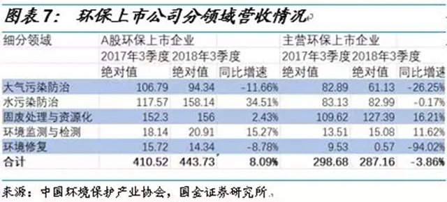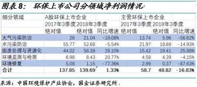 分領(lǐng)域來(lái)看,固廢處理與監(jiān)測(cè)行業(yè)業(yè)績(jī)表現(xiàn)相對(duì)較好。我們根據(jù)中國(guó)環(huán)境保護(hù)產(chǎn)業(yè)協(xié)會(huì)的統(tǒng)計(jì),選取了主營(yíng)業(yè)務(wù)涉及環(huán)保業(yè)務(wù)的A股環(huán)保上市公司120家,環(huán)保業(yè)務(wù)收入占主營(yíng)業(yè)務(wù)收入比例大于50%的51家主營(yíng)環(huán)保上市公司。主營(yíng)環(huán)保上市公司中2018年3季度固廢處理與資源化、環(huán)境監(jiān)測(cè)與監(jiān)測(cè)業(yè)績(jī)表現(xiàn)較好,營(yíng)收分別增長(zhǎng)16.21%和11.62%,凈利潤(rùn)分別增長(zhǎng)25.88%和-4.15%;環(huán)境修復(fù)與大氣污染防治業(yè)績(jī)表現(xiàn)較差,營(yíng)收分別下降94.02%和26.25%,凈利潤(rùn)分別下滑87.63%和56.62%。