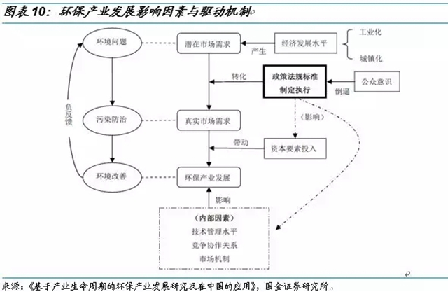 環(huán)保行業(yè)發(fā)展的核心邏輯在于環(huán)境問(wèn)題的出現(xiàn)—環(huán)境問(wèn)題的治理—環(huán)境質(zhì)量的改善,這一過(guò)程對(duì)應(yīng)環(huán)保產(chǎn)業(yè)的成長(zhǎng),表現(xiàn)為潛在市場(chǎng)需求的產(chǎn)生—實(shí)際市場(chǎng)需求的形成—環(huán)保產(chǎn)業(yè)的發(fā)展??梢钥闯?,環(huán)保產(chǎn)業(yè)的成長(zhǎng)邏輯也圍繞著市場(chǎng)需求的演變而展開(kāi)。影響環(huán)保行業(yè)驅(qū)動(dòng)因素作用于成長(zhǎng)邏輯主線的各個(gè)環(huán)節(jié),主要有經(jīng)濟(jì)發(fā)展水平、政策法規(guī)標(biāo)準(zhǔn)的制定執(zhí)行、公眾意識(shí)、資本要素投入等四類。
