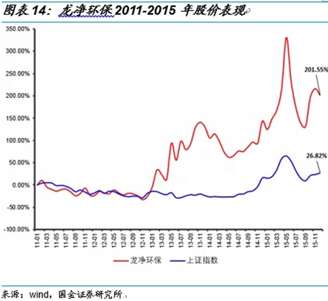 龍凈環(huán)保依靠其SCR煙氣脫硝技術(shù)將圓盤(pán)回旋混流技術(shù)與AIG氨噴射技術(shù)進(jìn)行有機(jī)結(jié)合,可保證氨/煙氣混合更加均勻;氨氣流量調(diào)節(jié)采用氣動(dòng)薄膜單座直通式調(diào)節(jié)閥組來(lái)實(shí)現(xiàn),具有線性調(diào)節(jié)性好、反應(yīng)動(dòng)作快、調(diào)節(jié)穩(wěn)定、密封性能好等優(yōu)點(diǎn),既可保證高脫硝率,又能準(zhǔn)確控制氨流量,保證氨逃逸率。采用該先進(jìn)技術(shù),可保證脫硝率達(dá)90%以上,氨逃逸<2.5ppm,SO2/SO3轉(zhuǎn)化率<1%。在2015年中電聯(lián)公布的簽訂合同的火電廠煙氣脫硝機(jī)組容量情況中,龍凈環(huán)保排名全國(guó)第二。隨著脫硝市場(chǎng)的快速釋放和業(yè)績(jī)的增加,公司股價(jià)從2011年初到2015年底上漲201.55%,跑贏上證指數(shù)175個(gè)百分點(diǎn),公司市值也由2011年初的71.5億增加至2015年底的185億。