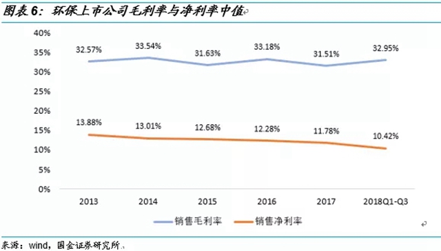 62家環(huán)保上市公司的毛利率中值穩(wěn)定,凈利率中值下滑。環(huán)保上市公司毛利率從2013年到2018年前三季度保持在31%-33%左右,凈利率則處于下降趨勢(shì),由2013年的13.88%下滑至2018年前三季度的10.42%。我們認(rèn)為隨著環(huán)保上市公司資產(chǎn)負(fù)債率的提升,由2013年的45.83%升至2018Q3的57.06%,公司財(cái)務(wù)費(fèi)用增加,凈利率不斷下滑。