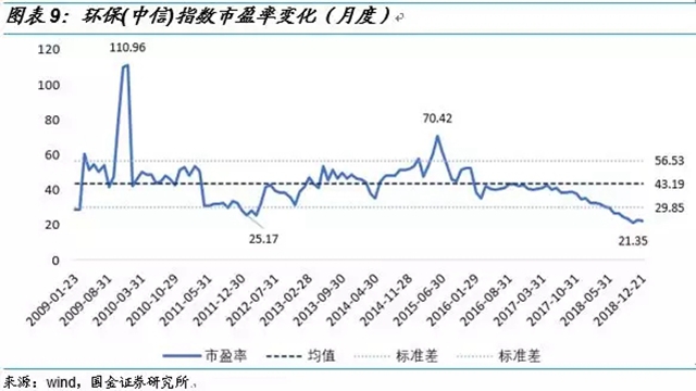 估值已到歷史底部。我們統(tǒng)計(jì)了2009年到2018年12月21日的環(huán)保(中信)指數(shù)的月度估值變化,2018年10月底行業(yè)估值跌至21.35X,目前維持在22X左右,處于近幾年的估值底部。
