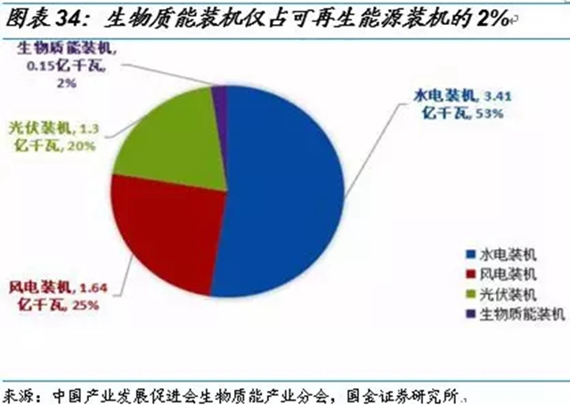 2017年生物質(zhì)發(fā)電量占總發(fā)電量的1.2%。截至2017 年12 月31 日,全國(guó)可再生能源發(fā)電裝機(jī)容量6.5億千瓦,占總電力裝機(jī)的36.6%。其中水電裝機(jī)(含抽水蓄能)3.41億千瓦,風(fēng)電裝機(jī)1.64億千瓦,光伏發(fā)電裝機(jī)1.3億千瓦,生物質(zhì)發(fā)電裝機(jī)1476萬(wàn)千瓦。2017 年全國(guó)總發(fā)電量65000 億千瓦時(shí),其中可再生能源發(fā)電量16979 億千瓦時(shí),占總發(fā)電量的26.1%。其中水電發(fā)電量11945 億千瓦時(shí),占總發(fā)電量的18.4%,風(fēng)電發(fā)電量3057 億千瓦時(shí),占總發(fā)電量的4.7%,光伏發(fā)電量1182 億千瓦時(shí),占總發(fā)電量的1.8%,生物質(zhì)發(fā)電量795 億千瓦時(shí),占總發(fā)電量的1.2%。