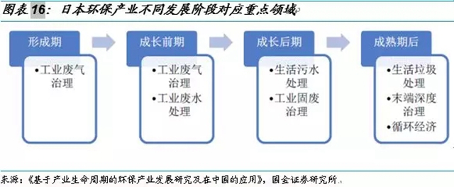 美國(guó)的環(huán)保行業(yè)在1990 年以后,末端治理領(lǐng)域產(chǎn)值增速放緩,資源回收領(lǐng)域逐漸發(fā)展; 2007 年開(kāi)始,末端治理逐漸保持穩(wěn)定并開(kāi)始出現(xiàn)下滑,新能源領(lǐng)域迅速發(fā)展,總體呈現(xiàn)明顯地周期擴(kuò)展趨勢(shì)。日本則是在公害事件后開(kāi)始以工業(yè)污染治理為主的第一輪快速發(fā)展;在1990 年后,以環(huán)境基礎(chǔ)設(shè)施集中建設(shè)與升級(jí)為主要對(duì)象,實(shí)現(xiàn)了第二輪成長(zhǎng)。在經(jīng)歷穩(wěn)定的成熟期后,環(huán)保產(chǎn)業(yè)發(fā)展重點(diǎn)逐步轉(zhuǎn)移至資源回收利用、綠色產(chǎn)品、氣候變化對(duì)策等領(lǐng)域,產(chǎn)業(yè)進(jìn)入外延擴(kuò)展的后成熟期。