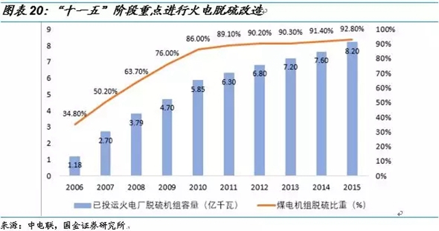 例如火電脫硫脫硝超低排放呈現(xiàn)階段性并進(jìn)入了成熟期,在“十一五”期間重點(diǎn)進(jìn)行全國(guó)煤電機(jī)組脫硫改造,全國(guó)煤電機(jī)組脫硫機(jī)組占比從2006年的34.80%快速提升至2010年的86%。“十二五”重點(diǎn)進(jìn)行了煤電脫硝改造,全國(guó)煤電機(jī)組脫硝比重從2011年的9.80%快速增長(zhǎng)到了2015年的95%。“十三五”期間重點(diǎn)進(jìn)行了超低排放改造,截止2017年底,全國(guó)范圍內(nèi)超低排放改造目標(biāo)任務(wù)完成率已達(dá)71%,東部地區(qū)已基本完成,部分中部地區(qū)省份也提前完成了改造任務(wù),預(yù)計(jì)2020年全國(guó)將全部火電超低排放改造。
