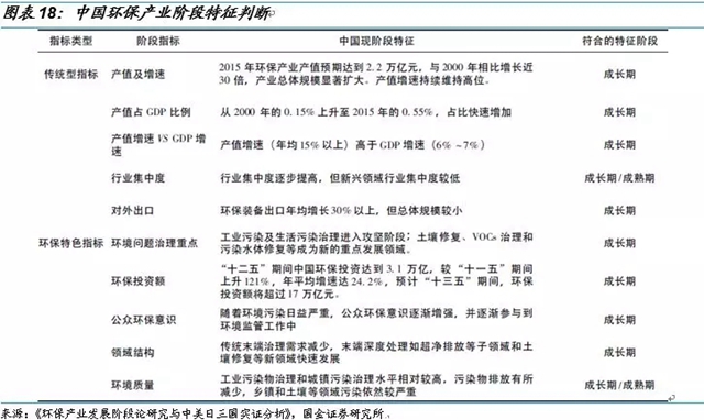 環(huán)保行業(yè)具有逆周期性和階段性,我國(guó)環(huán)保行業(yè)正處于成長(zhǎng)期。環(huán)保行業(yè)發(fā)展的前提是經(jīng)濟(jì)高速增長(zhǎng)帶來(lái)的資源耗損和污染積累,這使環(huán)保行業(yè)形成與發(fā)展上滯后于經(jīng)濟(jì)的快速發(fā)展期。當(dāng)經(jīng)濟(jì)增長(zhǎng)向中高速發(fā)展甚至下滑時(shí),之前經(jīng)濟(jì)高速發(fā)展所掩蓋的資源環(huán)境問(wèn)題開(kāi)始凸顯并受到重視。另外在經(jīng)濟(jì)衰退過(guò)程中,政府還將依靠財(cái)政投資來(lái)拉動(dòng)低迷的經(jīng)濟(jì)增長(zhǎng)。此時(shí),具有基礎(chǔ)設(shè)施建設(shè)內(nèi)容、與國(guó)民經(jīng)濟(jì)其他部門(mén)關(guān)聯(lián)性強(qiáng)、具有綜合效益的環(huán)保產(chǎn)業(yè)也將得到大量的資金投入,帶動(dòng)其快速發(fā)展。因此環(huán)保產(chǎn)業(yè)的形成與發(fā)展具有較強(qiáng)的逆經(jīng)濟(jì)周期性。我國(guó)環(huán)保產(chǎn)業(yè)發(fā)展正處于成長(zhǎng)期向成熟期的邁進(jìn)的重要階段,在中長(zhǎng)期內(nèi)仍有較大的發(fā)展空間和潛力。