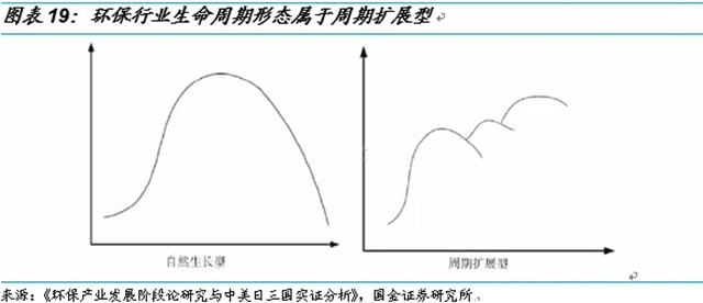 常杪在《環(huán)保產(chǎn)業(yè)發(fā)展階段論研究與中美日三國(guó)實(shí)證分析》提出,環(huán)保產(chǎn)業(yè)的生命周期形態(tài)屬于周期擴(kuò)展型,即隨著環(huán)保產(chǎn)業(yè)的發(fā)展和環(huán)境質(zhì)量的改善,環(huán)保產(chǎn)業(yè)發(fā)展重心將根據(jù)需求的變化而發(fā)生改變,進(jìn)而帶來(lái)新的周期性發(fā)展。