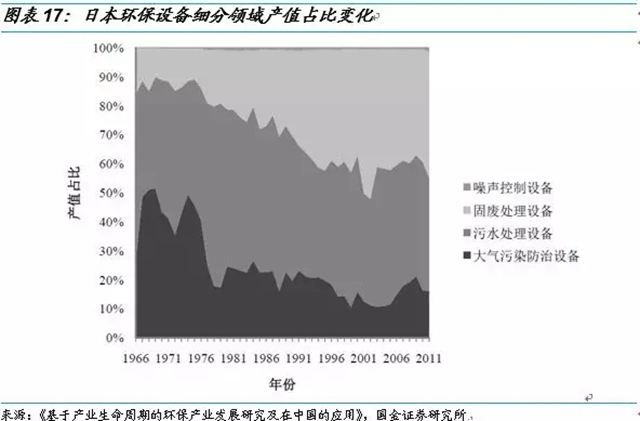不同階段對(duì)應(yīng)不同細(xì)分領(lǐng)域結(jié)構(gòu)變化。日本環(huán)保設(shè)備細(xì)分領(lǐng)域產(chǎn)值占比中,污水處理設(shè)備、固體廢物處理設(shè)備、大氣污染防治設(shè)備一直占據(jù)并瓜分了90%以上的份額。其中,大氣領(lǐng)域在早期占比最多,而在經(jīng)歷了60-70 年代的高峰后占比逐年下滑,隨后污水領(lǐng)域成為最大主體,但自80 年代中后期也有所下降,相對(duì)地,固廢處理領(lǐng)域的占比則逐漸上升,在90 年代以后占據(jù)多數(shù)份額。細(xì)分領(lǐng)域的產(chǎn)值占比變化反映了日本環(huán)保產(chǎn)業(yè)內(nèi)部結(jié)構(gòu)性調(diào)整的大趨勢(shì),這也與環(huán)境問(wèn)題的治理階段相對(duì)應(yīng)。
