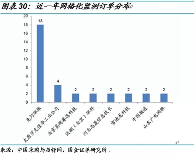 我們統(tǒng)計(jì)了2017年第四季度到2018年第三季度的所有網(wǎng)格化監(jiān)測(cè)項(xiàng)目訂單,共統(tǒng)計(jì)76個(gè)訂單,總金額為5.41億元。先河環(huán)保中標(biāo)訂單個(gè)數(shù)和金額分別為18個(gè)和1.93億元,分別占比達(dá)到了24%和36%,而排名第二的公司所獲訂單個(gè)數(shù)和金額分別為4個(gè)和2606萬(wàn),分別占比5.3%和4.8%。先河環(huán)保的網(wǎng)格化監(jiān)測(cè)市占率遙遙領(lǐng)先,目前處于一家獨(dú)大的地位。