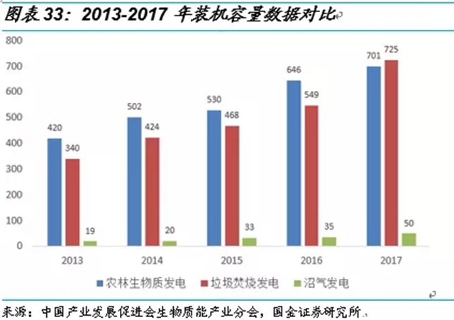 2017 年,垃圾焚燒發(fā)電裝機(jī)容量達(dá)725.1萬(wàn)千瓦,較上年增長(zhǎng)32.1%;農(nóng)林生物質(zhì)發(fā)電裝機(jī)容量達(dá)700.77萬(wàn)千瓦,較上年增長(zhǎng)8.4%;沼氣發(fā)電裝機(jī)容量達(dá)49.9萬(wàn)千瓦,較上年增長(zhǎng)42.9%。2017 年,垃圾焚燒發(fā)電裝機(jī)容量增長(zhǎng)速度快于農(nóng)林生物質(zhì)裝機(jī)容量增速,垃圾發(fā)電裝機(jī)容量5 年內(nèi)首次超過(guò)農(nóng)林生物質(zhì)發(fā)電裝機(jī)容量。